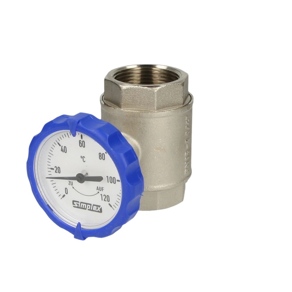 Ball valve with thermometer in the handle. The handle can be exchanged for a wing handle. It has full bore, is insulated completely and fitted with a gland. The thread is standardised in accordance with ISO 228/1.