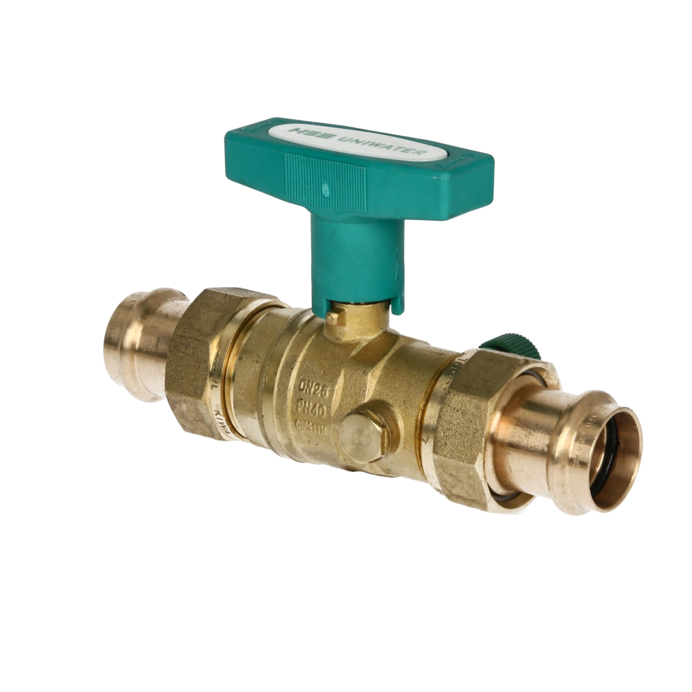 DVGW-certified system ball valve Uniwater with ISO T-handle. The ball valve is dead space-optimised to ensure that no legionella formation is possible. DIN face-to-face lengths allow easy replacement with free flow valves.