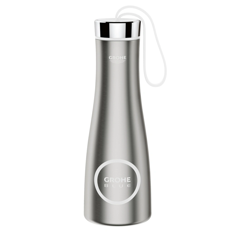 The drinking bottle is made of double-walled stainless steel fitted with GROHE Blue Decor. At the cap, there is a loop for comfortable carrying while running.