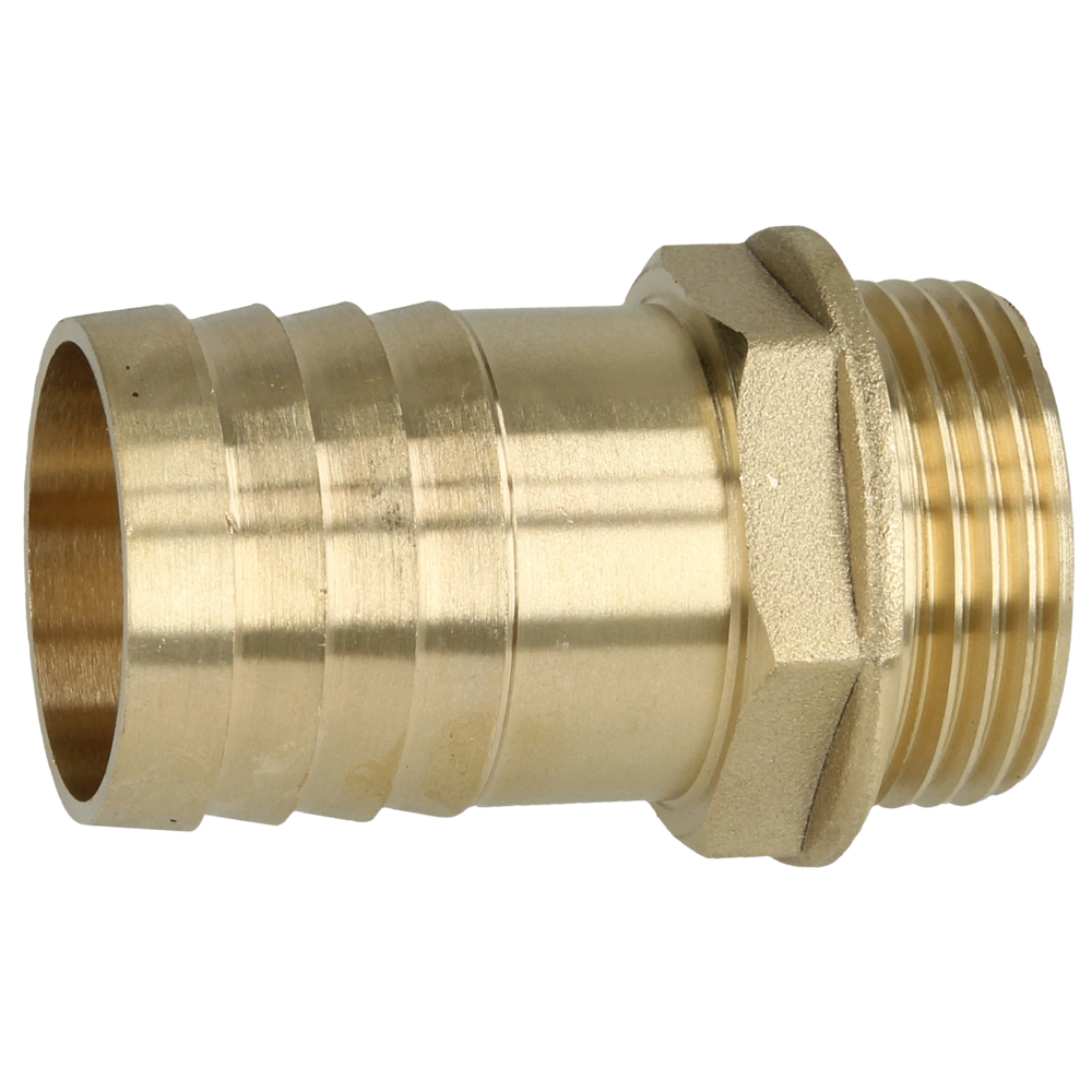 Brass nozzle with hexagon for the connection of 1 1/4" hoses to taps with 1" female thread.