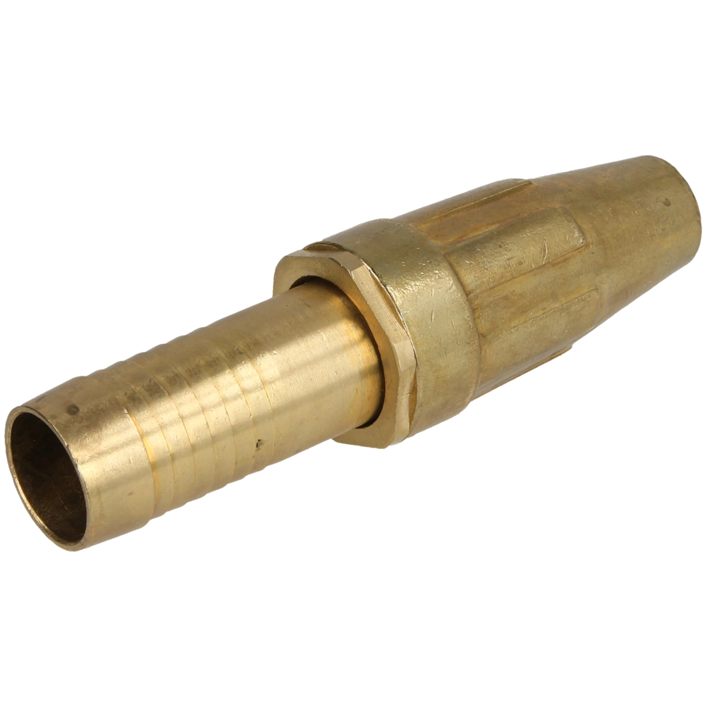 The spray nozzle in heavy-duty design is equipped with a fixed hosetail. It can be opened or closed by rotation.