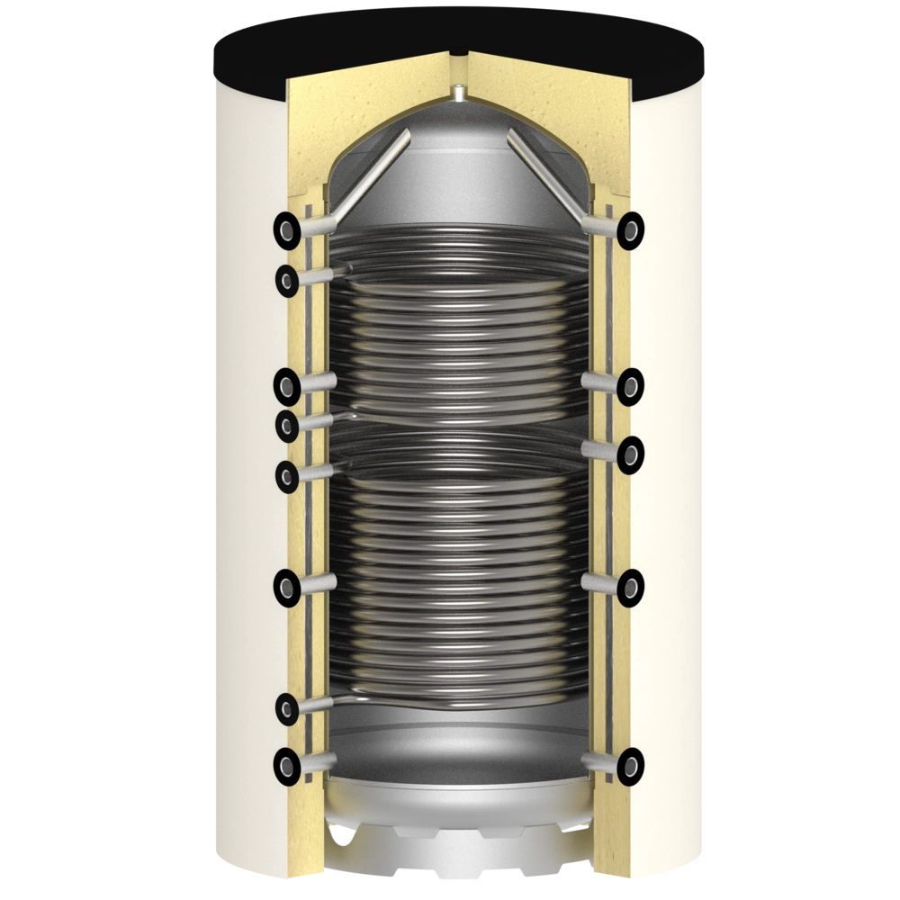 All product informationPremium buffer storage tank for highest demands on heat storage and efficiency. Particularly with systems that use heat generators which achieve optimum efficiency only under full load (e.g. many solid fuel boilers). While the heat generator is in operation, it generates more heat than is consumed by users. The surplus heat heats up the water in the buffer storage tank and is stored. During downtimes, this heat can later be retrieved as needed.