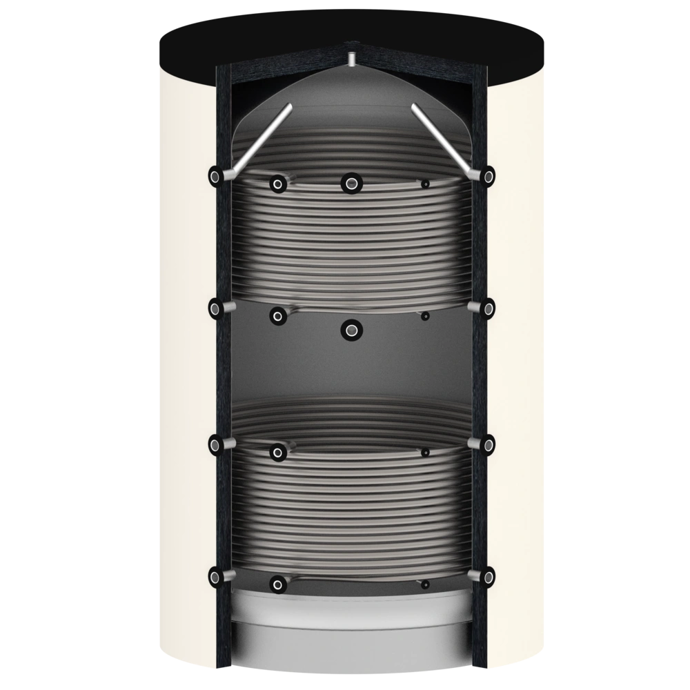 Premium buffer storage tank for highest demands on heat storage and efficiency. Particularly with systems that use heat generators which achieve optimum efficiency only under full load (e.g. many solid fuel boilers). While the heat generator is in operation, it generates more heat than is consumed by users. The surplus heat heats up the water in the buffer storage tank and is stored. During downtimes, this heat can later be retrieved as needed.