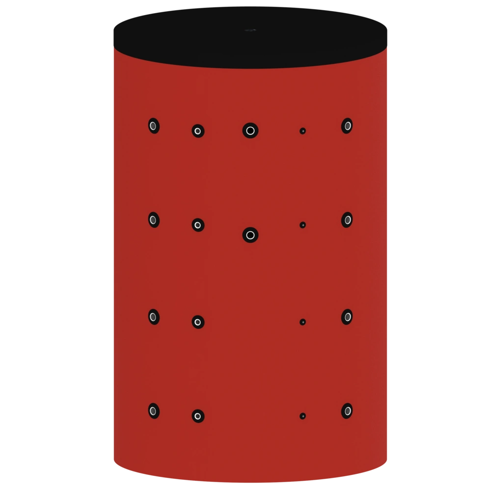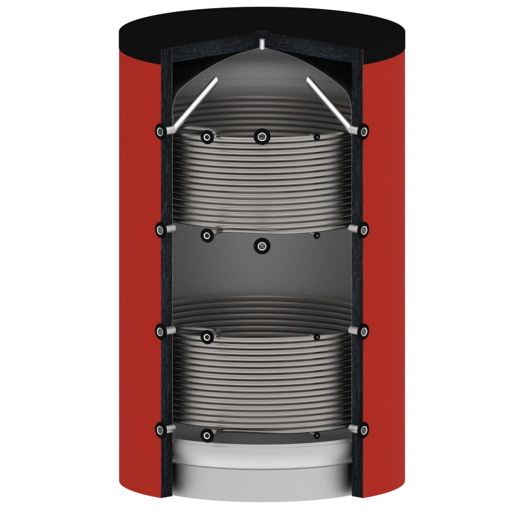 Premium buffer storage tank for highest demands on heat storage and efficiency. Particularly with systems that use heat generators which achieve optimum efficiency only under full load (e.g. many solid fuel boilers). While the heat generator is in operation, it generates more heat than is consumed by users. The surplus heat heats up the water in the buffer storage tank and is stored. During downtimes, this heat can later be retrieved as needed.