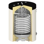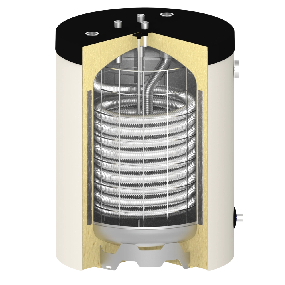 The built-in corrugated stainless steel pipe separates the drinking water from the heating water and also serves as a high-performance heat exchanger. This combines the advantages of a buffer storage tank with those of an instantaneous water heater.