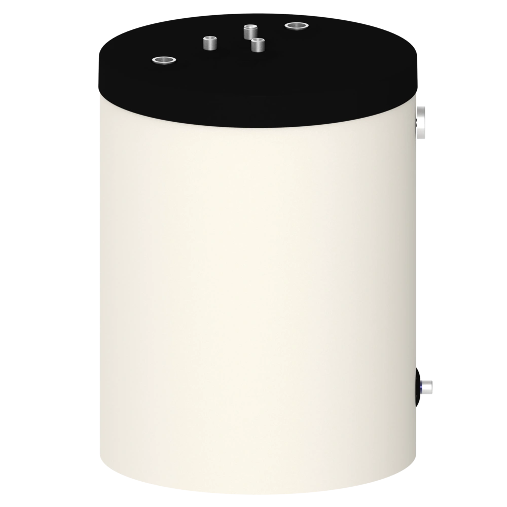 The storage tank is designed with connections towards the top, and its compact design makes it particularly suitable for DHW heating as a built-under fresh-water storage tank with wall-mounted heaters. The dimensions have been selected so that it is replacement-compatible with the built-under storage tanks of many renowned manufacturers. The storage tank can also demonstrate its strengths in new installations in conjunction with wall-mounted heaters.