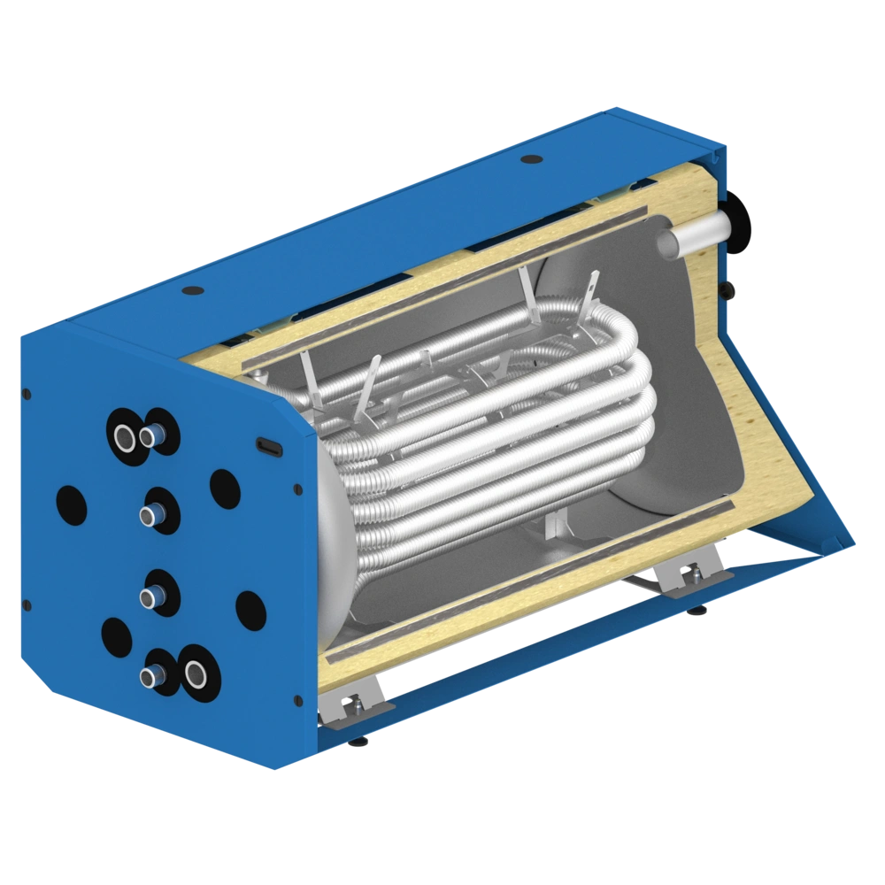 Ce ballon est un stockage d'eau douce. L'eau potable circule à travers un échangeur de chaleur en acier inoxydable et est ainsi chauffée.