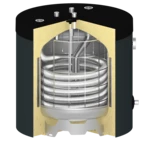 The storage tank is designed with connections towards the top, and its compact design makes it particularly suitable for DHW heating as a built-under fresh-water storage tank with wall-mounted heaters. The dimensions have been selected so that it is replacement-compatible with the built-under storage tanks of many renowned manufacturers. The storage tank can also demonstrate its strengths in new installations in conjunction with wall-mounted heaters.