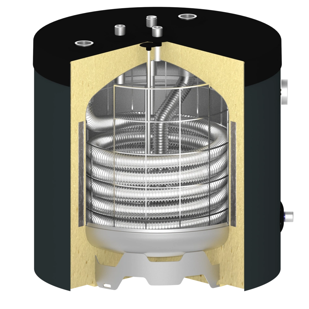 The structure of fresh-water storage tanks differs fundamentally from conventional, large-volume domestic hot water storage tanks. A built-in corrugated stainless steel pipe separates the drinking water from the heating water and also serves as a high-performance heat exchanger. This combines the advantages of a buffer storage tank with those of an instantaneous water heater.