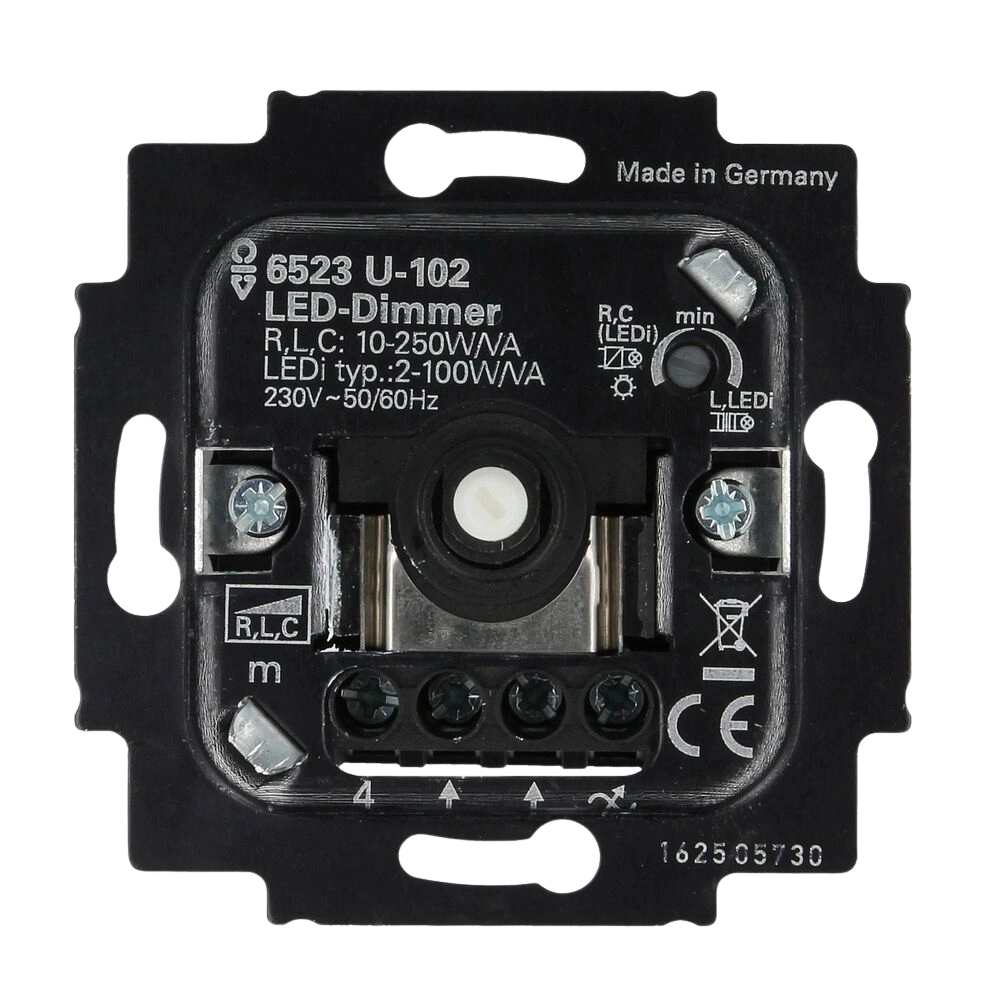 The insert is equipped with a rotary control, a 2way on-off switch, a soft-catch and a terminal for net disconnection devices, and it provides 2-wire connection (neutral conductor not required). Dimming can be controlled by a cover plate with neon lamp. (not included).