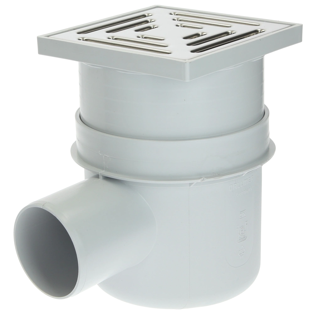 The cellar drain has a rotatable stacking frame as well as a detachable odour trap and a sludge filter. The stainless steel grate has a size of 14 x 14 cm.