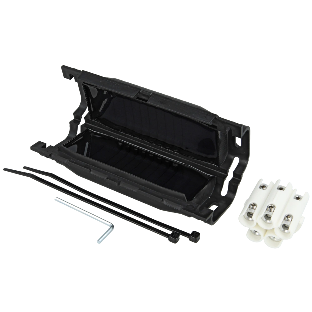 Joint with complete gel sealing and cross-sectional branch-off block for connecting all standard plastic cables with 3 to 5 conductors. The flame-retardant and UV-resistant mould is made of high-quality and impact-resistant plastic...