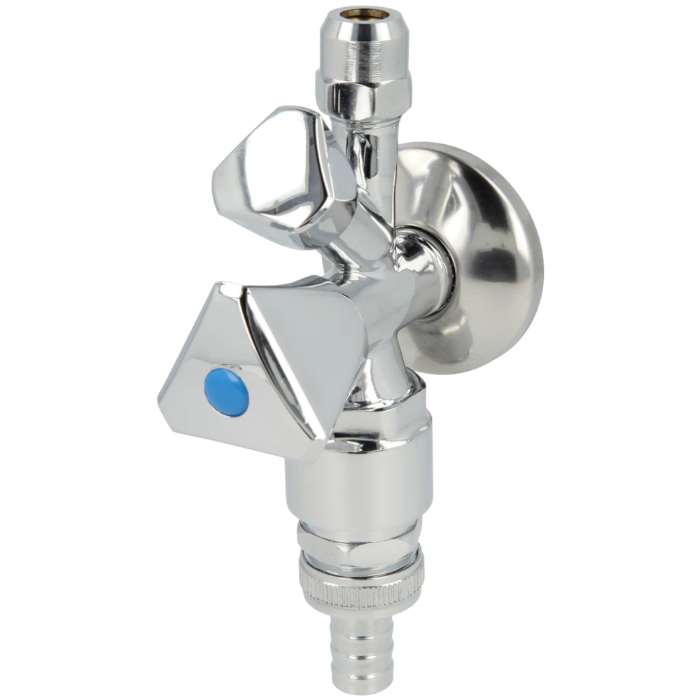 The combination angle valve with three-cornered canopy handle in heavy design is equipped with anti-vacuum device, backflow preventer and push rosette.