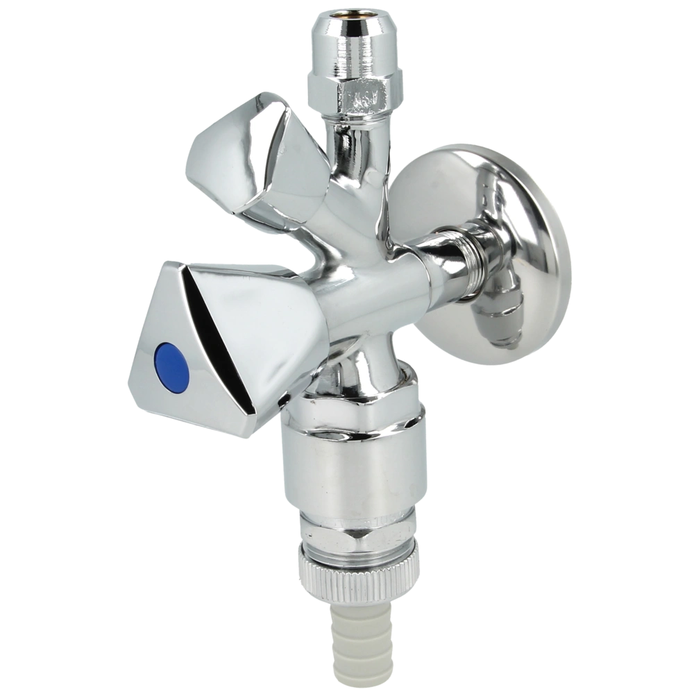 Self-sealing combination angle valve made of chrome-plated brass in heavy-duty design with three-cornered tap handle. The PA-tested angle valve has a 3/8‘ x 10 mm compression fitting with length compensation,...