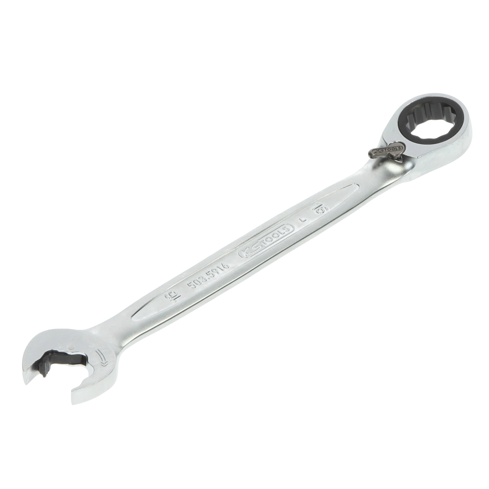 The combination spanners with FlankTraction profile have a ratchet mechanism in ring and open jaw. The ratchets are equipped with 72 teeth and reversible. Both sides are 15° offset.