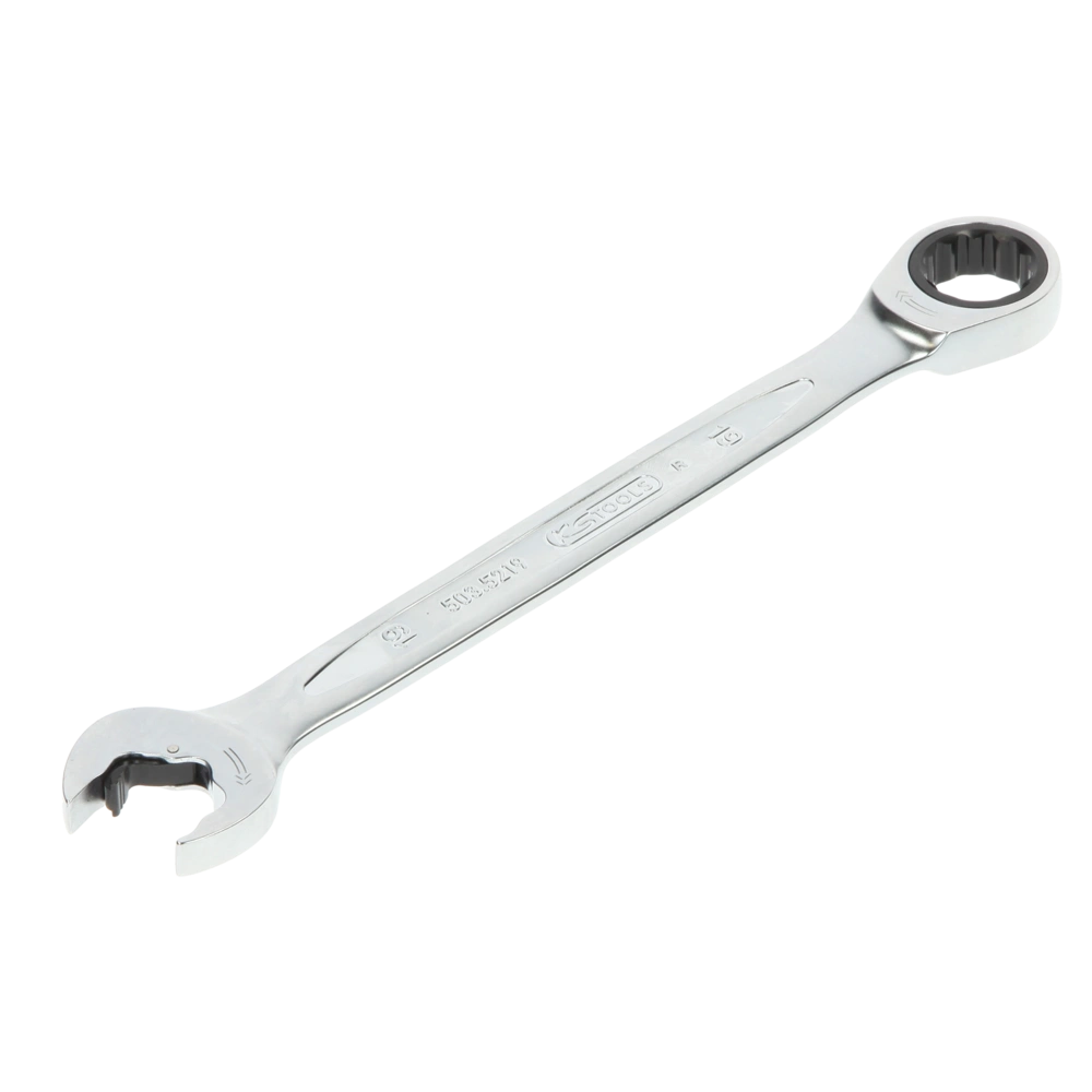 Combination spanner with ratchet mechanism in ring and open jaw 19 mm