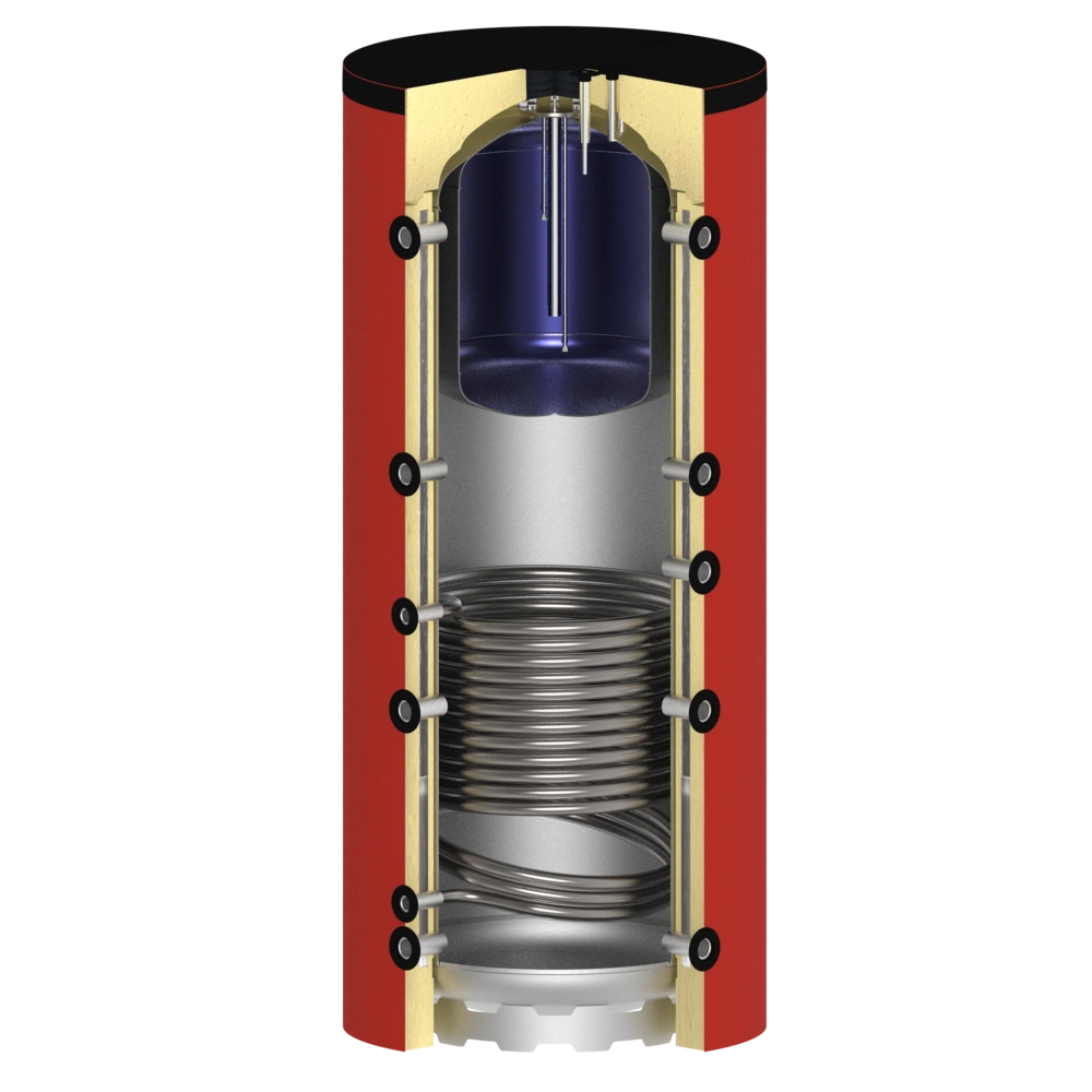 The integrated potable water tank is automatically heated by the surrounding heating water. In this way, combination tanks effectively and space-efficiently unite the benefits of buffer tanks and potable water tanks. They are ideal for use with solar thermal systems for heating support and are also suitable for operation with multiple energy sources while requiring minimal control effort