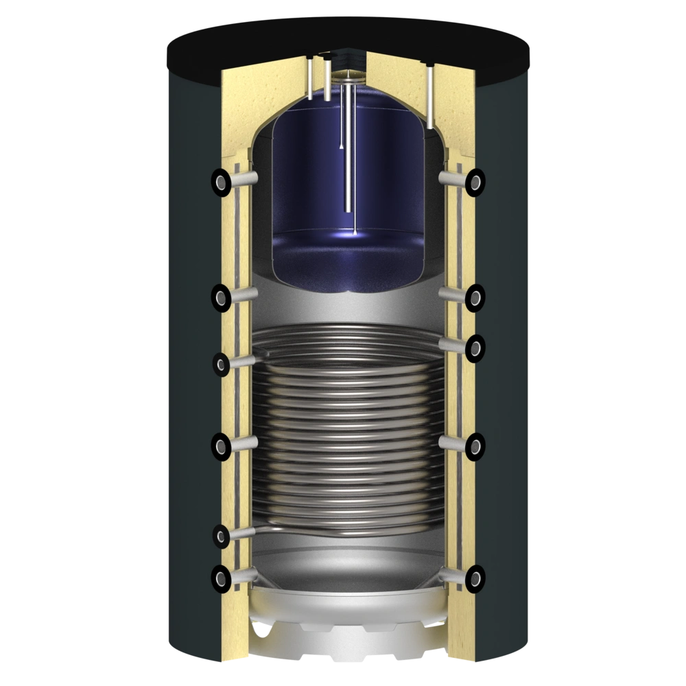 The integrated potable water tank is automatically heated by the surrounding heating water. In this way, combination tanks effectively and space-efficiently unite the benefits of buffer tanks and potable water tanks. They are ideal for use with solar thermal systems for heating support and are also suitable for operation with multiple energy sources while requiring minimal control effort