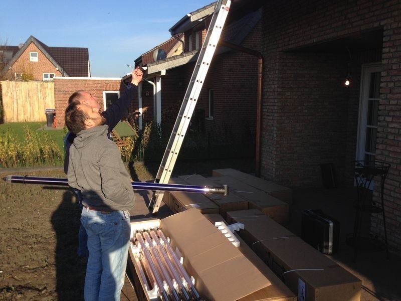 5 OEG sales representatives have got an answer to this question: learning by doing! So the Friday before last they knuckled down and rolled up their sleeves. With an OEG service technician on-site a 4flex® solar system was installed. After a short briefing, it all started with the mounting of rafter anchors and rails on the roof. This was easily done within only a short time and they could begin to mount the 4flex®tubes. After the first tube had been fixed onto the mounting rail with just one screw, the other tubes weighing only 2.2 kg could be rapidly mounted onto the roof with the simple click-fit system - no additional tools neccessary. Now they only had to install the Spirovent solar micro bubble separator, fix the connection sets and connect the corrugated solar pipe. All the roof work was finished then. After a short coffee break, work continued in the attic. The expansion vessel and the solar station were installed and connected with the solar line. After the pre-pressure had been checked and set at 1.2 bar and the collector and tank sensor had been connected, the system could be filled by means of the OEG filling station. Only the adjustment of the OEG controller KS2W was left to be done. All the participants were enthusiastic about how uncomplicated the adjustment of the parameters was. Then the great moment was there - commissioning! All the employees were proud of their first selfmade 4flex® solar power system and they are already looking forward to their next learning-by-doing project.