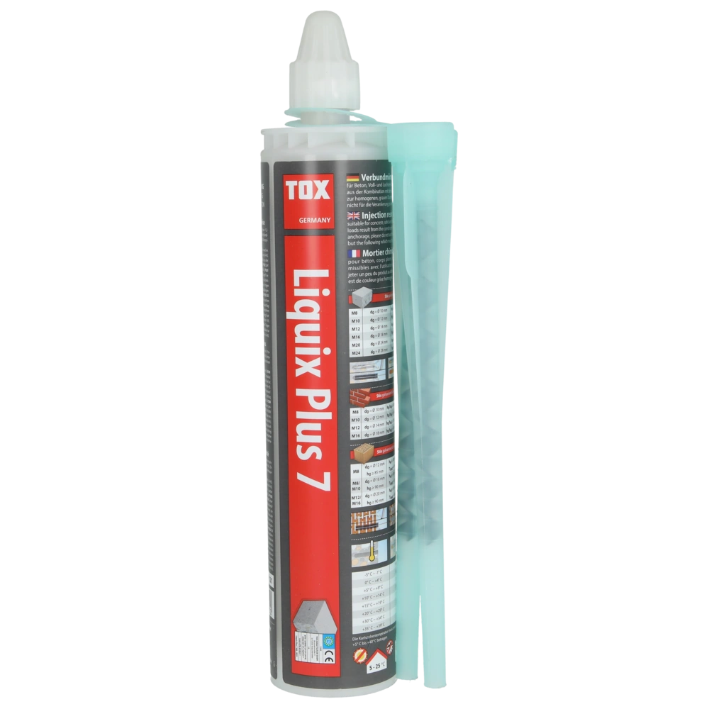 All product information Scope of deliveryThe TOX composite mortar Liquix Plus 7 can be used for anchoring standard threaded rods. The styrene-free composite mortar can be used even at very low temperatures down to -5°C and can also be applied in wet drill holes. It provides low axis and edge distances due to expansion-free anchorage and is suitable for fixing high loads of up to 3.7 tons of weight. It is approved of for uncracked concrete, perforated brick and solid brick.