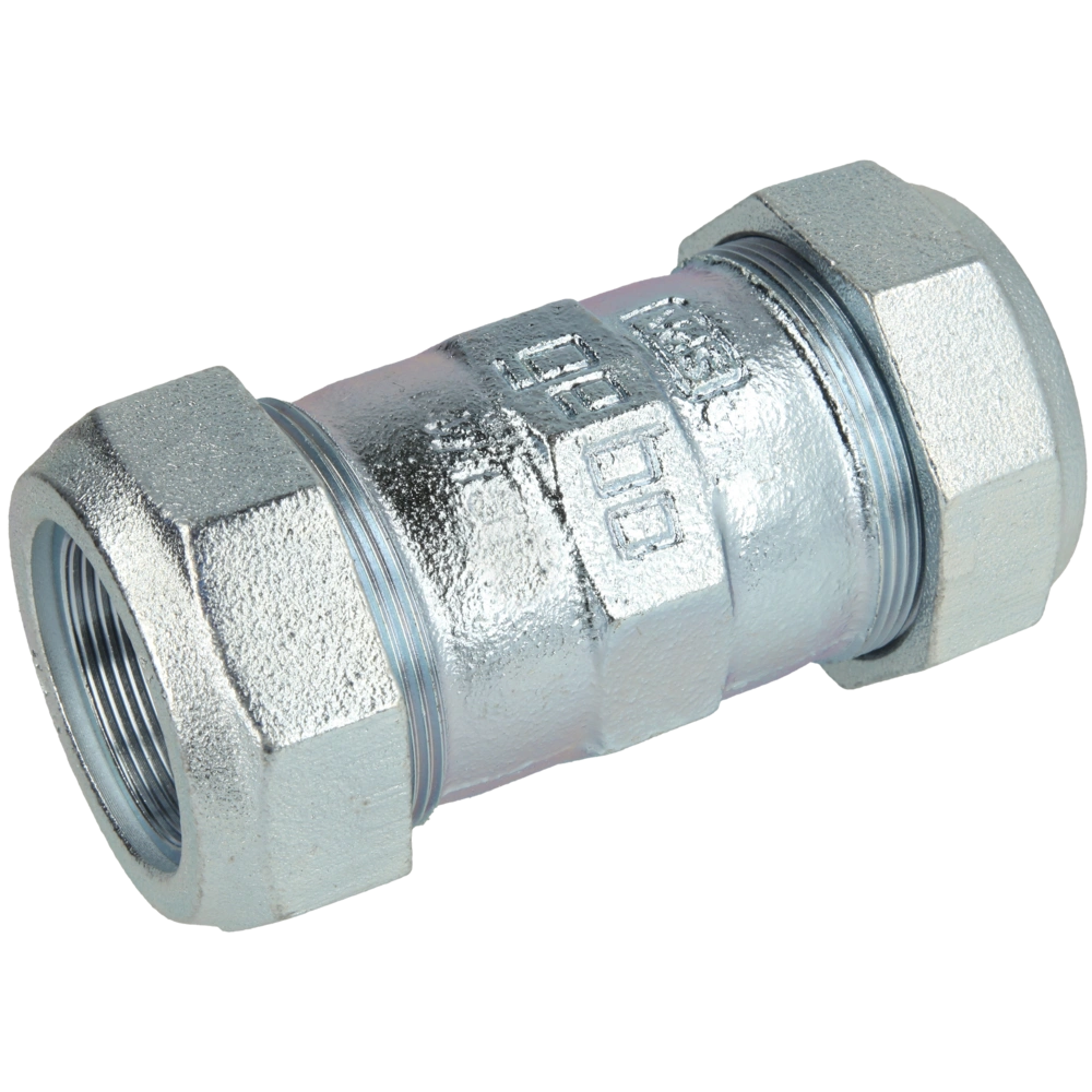 Malleable cast-iron compression fitting for easy installation and repair of steel pipes. The compression fitting is force-fitting, both resistant to tensile and shearing strength and can also be used as equipotential bonding.
