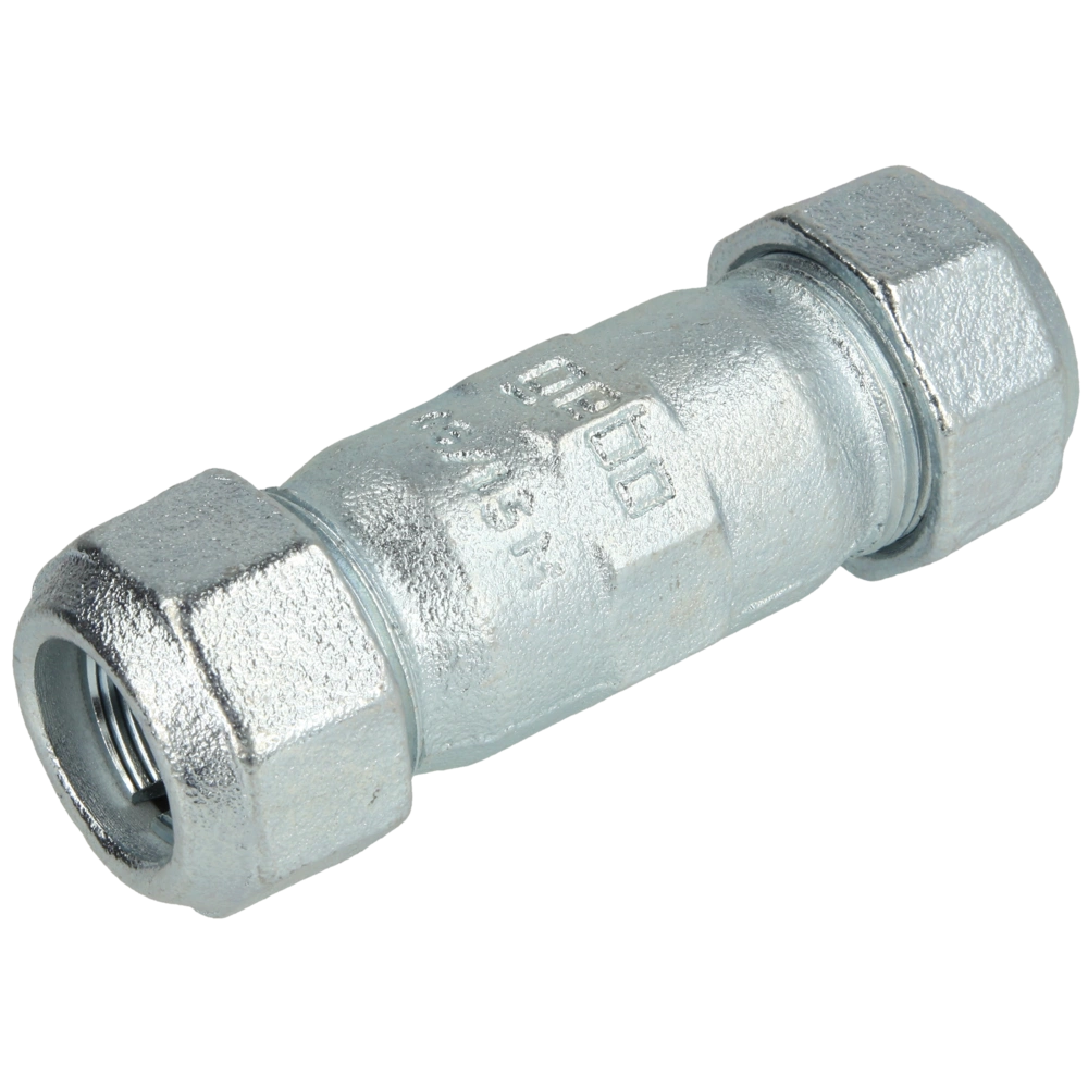 Malleable cast-iron compression fitting for easy installation and repair of steel pipes. The compression fitting is force-fitting, both resistant to tensile and shearing strength and can also be used as equipotential bonding.