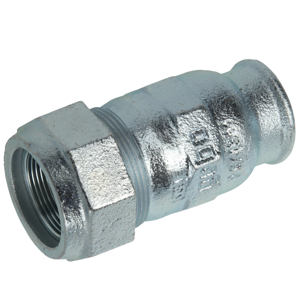 Malleable cast-iron compression fitting for easy installation and repair of steel pipes. The compression fitting is force-fitting, both resistant to tensile and shearing strength and can also be used as equipotential bonding.
