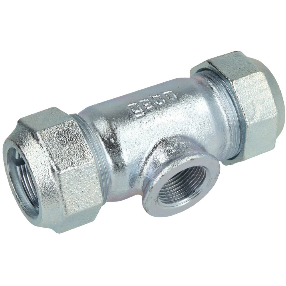 Malleable cast-iron compression fitting for easy installation and repair of steel pipes. The compression fitting is force-fitting, both resistant to tensile and shearing strength and can also be used as equipotential bonding.