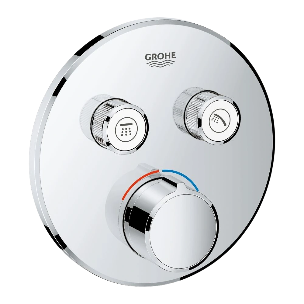 The concealed mixer with two shut-off valves has a covered escutcheon and shaft sealing. The GROHE QuickFix covered fixing can be subsequently adjusted by 6°. Push the button to start or stop the water, turn to adjust the water volume. The symbols on the buttons are exchangeable. Multiple outlets can be used simultaneously. The GROHE StarLight finish is easy to clean and scratch-resistant.