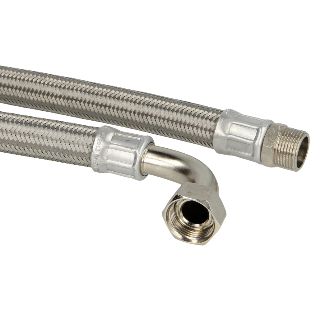 Connecting hose for sanitary and drinking water applications with hygienic plastic tube and durable stainless steel sheath.