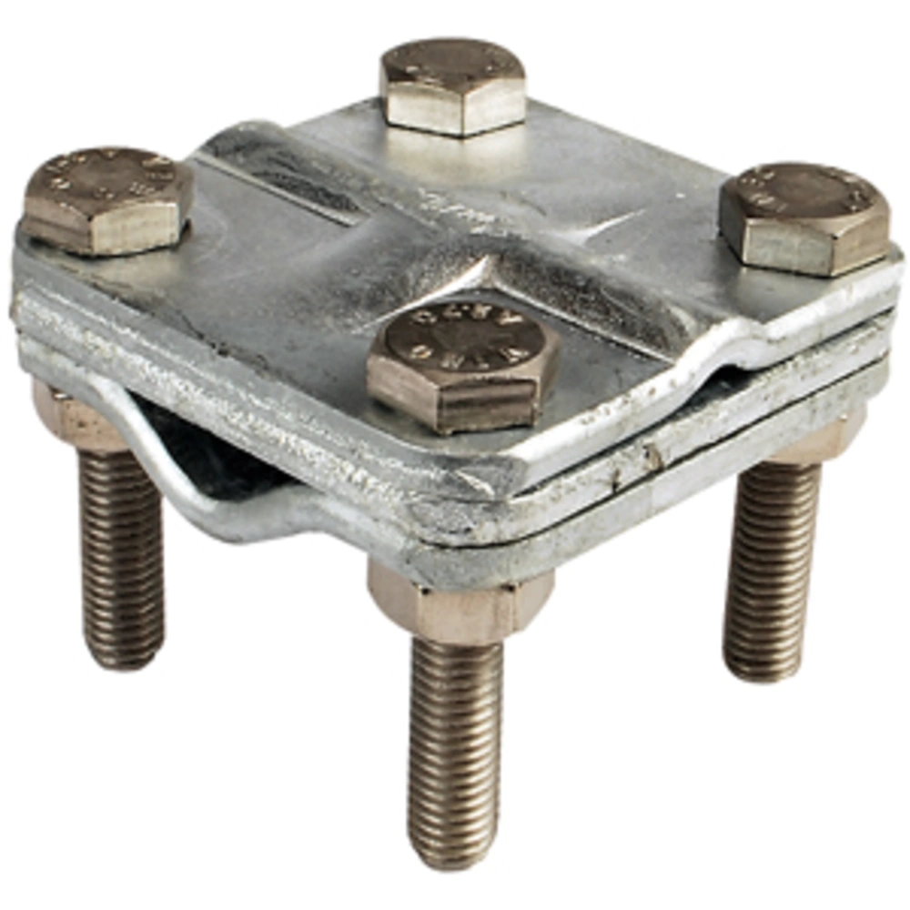 Single-screw connection clamp for cross and parallel connection of round conductors, flat strips or cables to earth rods.