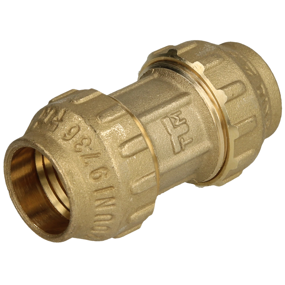 Brass compression fitting with brass compression ring for the connection of PE pipes in drinking water installations.