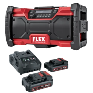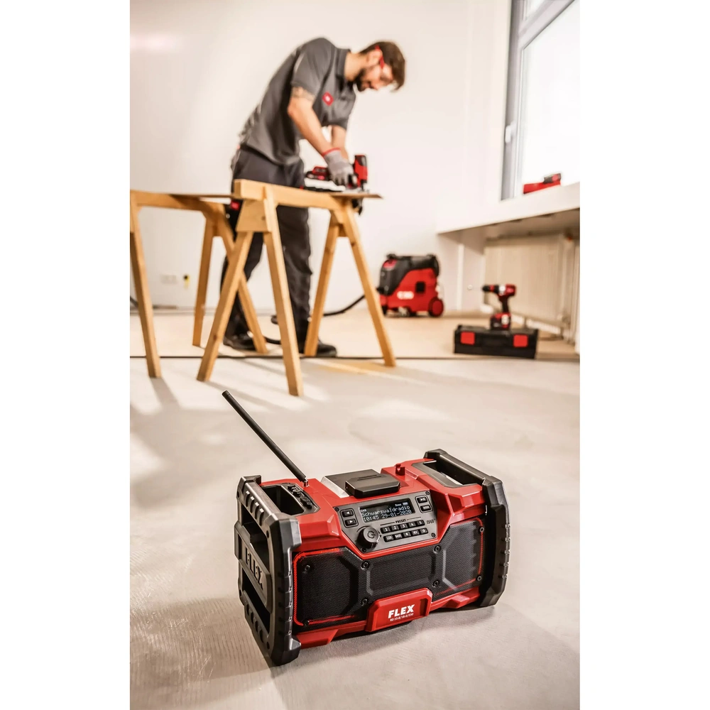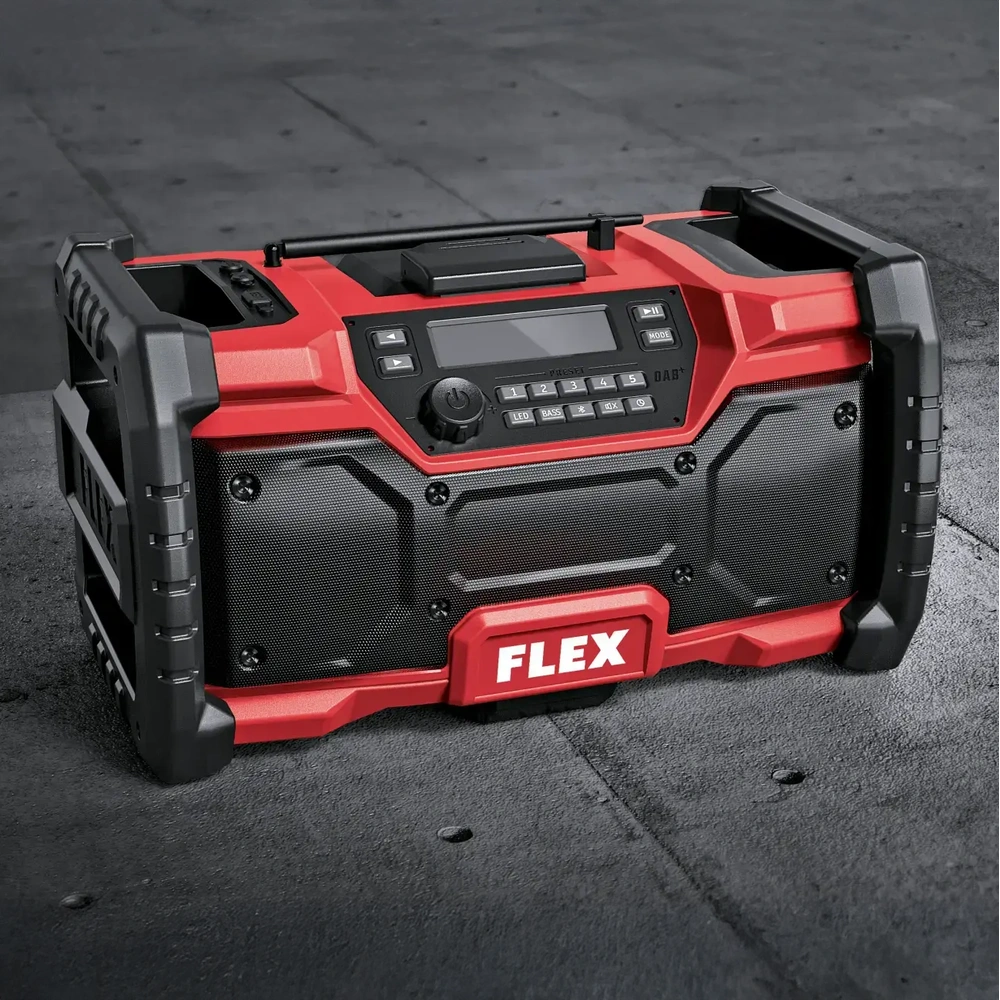 Heavy-duty, digital construction site radio with Bluetooth interface, USB port and charging option for smartphone or tablet. The radio can be powered with battery or grid. The loudspeakers and the bass boost provide for good sound quality...