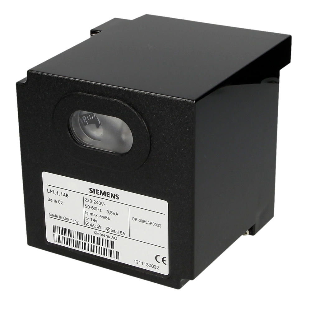 The Siemens LFL1.148 automatic burner control unit is suitable for gas, oil or dual-fuel forced draught burners with medium to high output, as well as for multi-stage or modulating burners in intermittent...