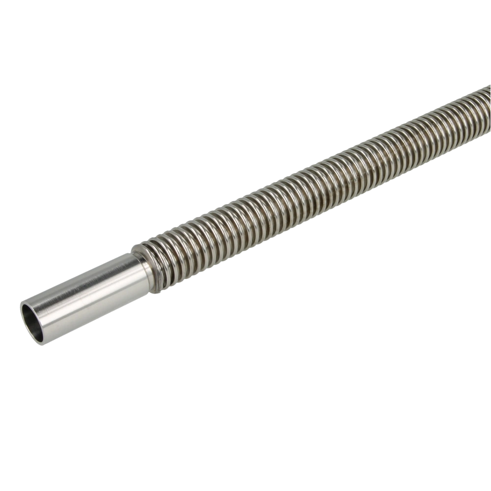 Corrugated stainless steel pipe for quick and flexible connection of storage tanks, boilers and expansion vessels, for example. With two welded-on pipe sockets, it is suitable for compression fittings.