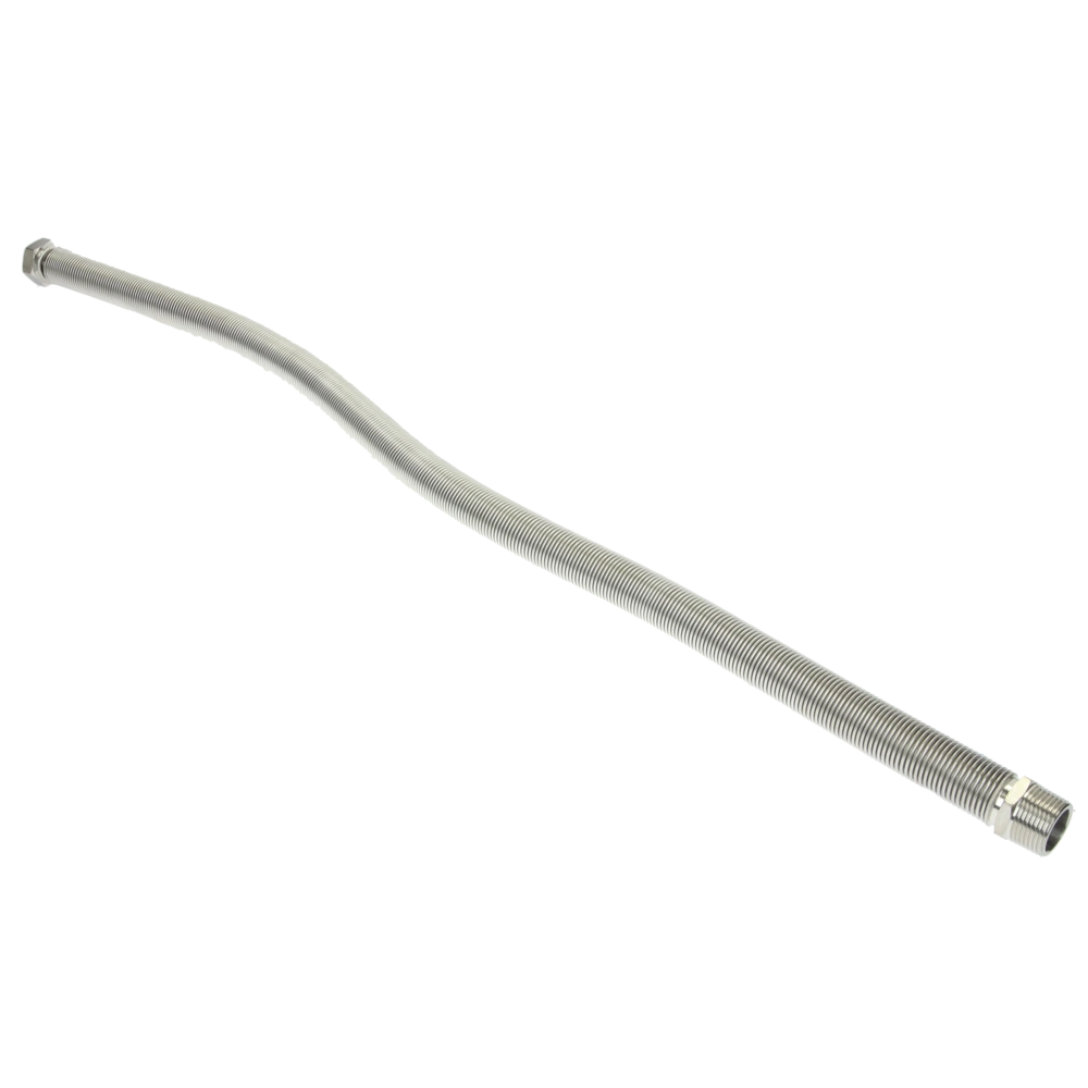 All product informationHigh-quality, extendable corrugated stainless steel pipes for the flexible connection of heat pumps, storage tanks, solar thermal systems, boilers and componants in the house and in industrial plants. The pipes can be extended to their double basic length and are flexible in all directions. They are supplied with a conical male thread and union nut.
