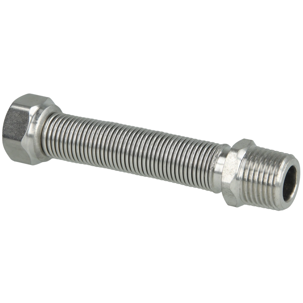 All product informationHigh-quality, extendable corrugated stainless steel pipes for the flexible connection of heat pumps, storage tanks, solar thermal systems, boilers and componants in the house and in industrial plants. The pipes can be extended to their double basic length and are flexible in all directions. They are supplied with a conical male thread and union nut.