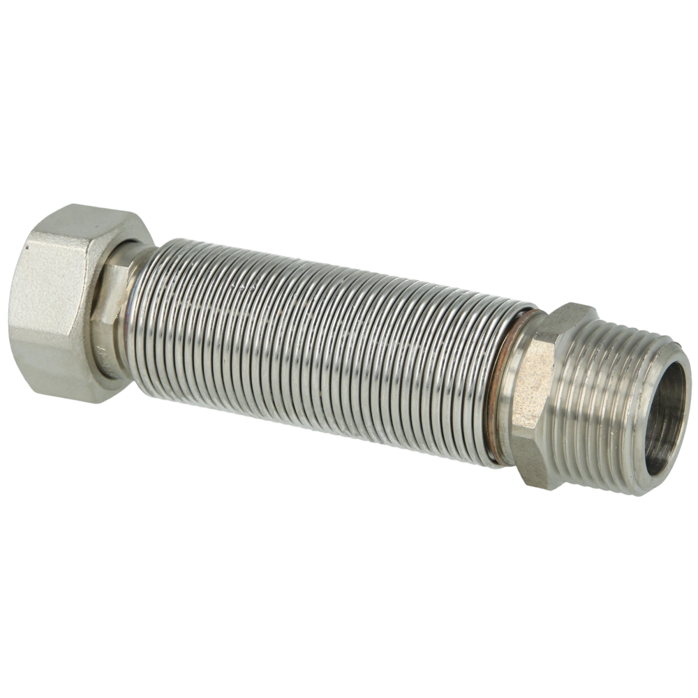 All product informationHigh-quality, extendable corrugated stainless steel pipes for the flexible connection of heat pumps, storage tanks, solar thermal systems, boilers and componants in the house and in industrial plants. The pipes can be extended to their double basic length and are flexible in all directions. They are supplied with a conical male thread and union nut.