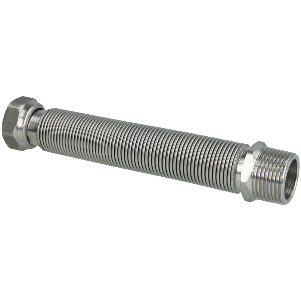 All product informationHigh-quality, extendable corrugated stainless steel pipes for the flexible connection of heat pumps, storage tanks, solar thermal systems, boilers and componants in the house and in industrial plants. The pipes can be extended to their double basic length and are flexible in all directions. They are supplied with a conical male thread and union nut.