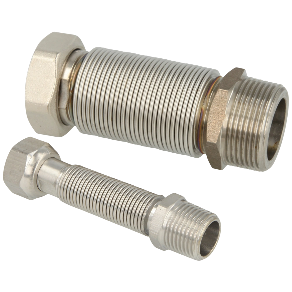 All product informationHigh-quality, extendable corrugated stainless steel pipes for the flexible connection of heat pumps, storage tanks, solar thermal systems, boilers and componants in the house and in industrial plants. The pipes can be extended to their double basic length and are flexible in all directions. They are supplied with a conical male thread and union nut.