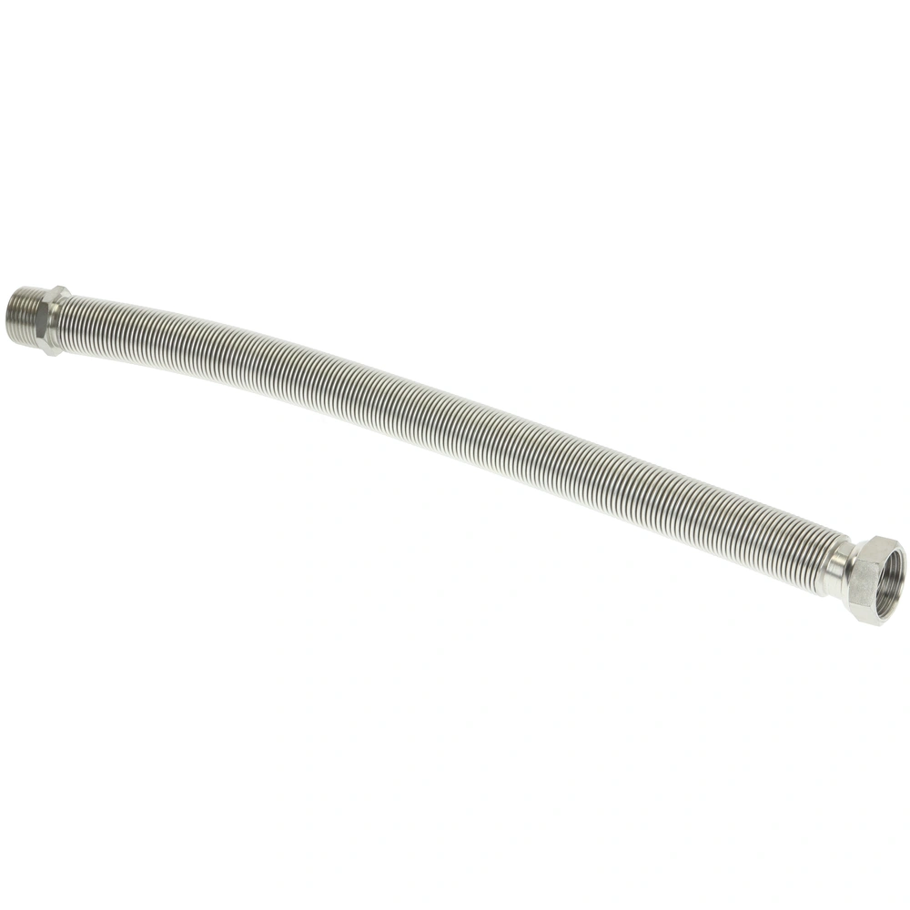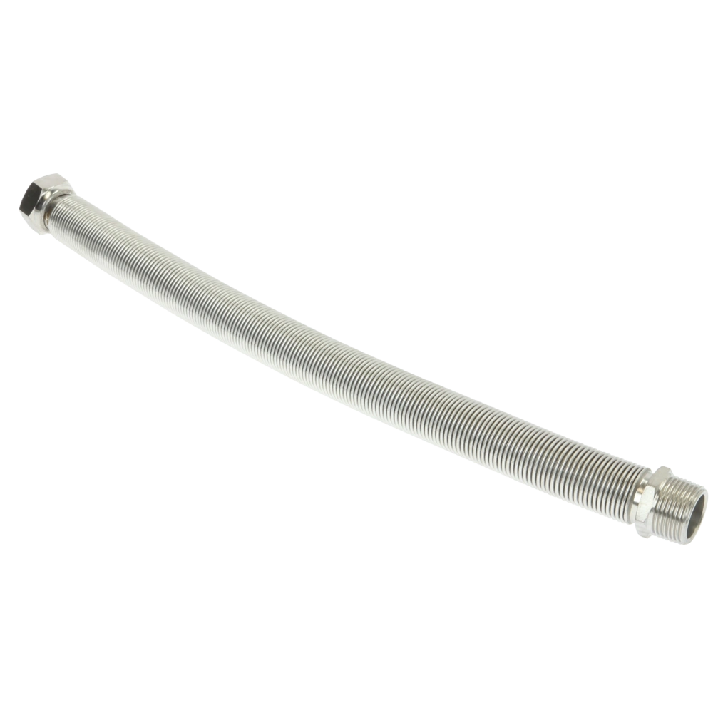 High-quality, extendable corrugated stainless steel pipes for the flexible connection of heat pumps, storage tanks, solar thermal systems, boilers and componants in the house and in industrial plants. The pipes can be extended to their double basic length and are flexible in all directions. They are supplied with a conical male thread and union nut.
