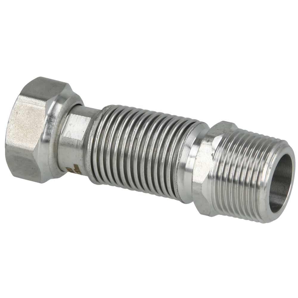 All product informationHigh-quality, extendable corrugated stainless steel pipes for the flexible connection of heat pumps, storage tanks, solar thermal systems, boilers and componants in the house and in industrial plants. The pipes can be extended to their double basic length and are flexible in all directions. They are supplied with a conical male thread and union nut.
