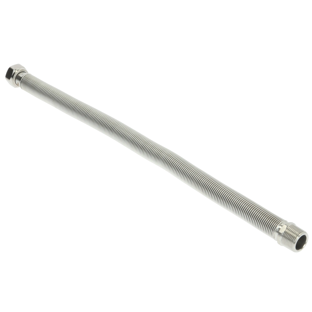 All product informationHigh-quality, extendable corrugated stainless steel pipes for the flexible connection of heat pumps, storage tanks, solar thermal systems, boilers and componants in the house and in industrial plants. The pipes can be extended to their double basic length and are flexible in all directions. They are supplied with a conical male thread and union nut.