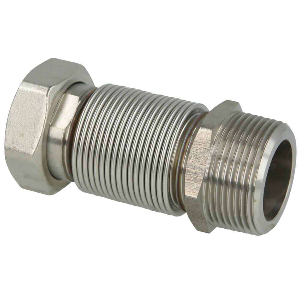 High-quality, extendable corrugated stainless steel pipes for the flexible connection of heat pumps, storage tanks, solar thermal systems, boilers and componants in the house and in industrial plants. The pipes can be extended to their double basic length and are flexible in all directions. They are supplied with a conical male thread and union nut.