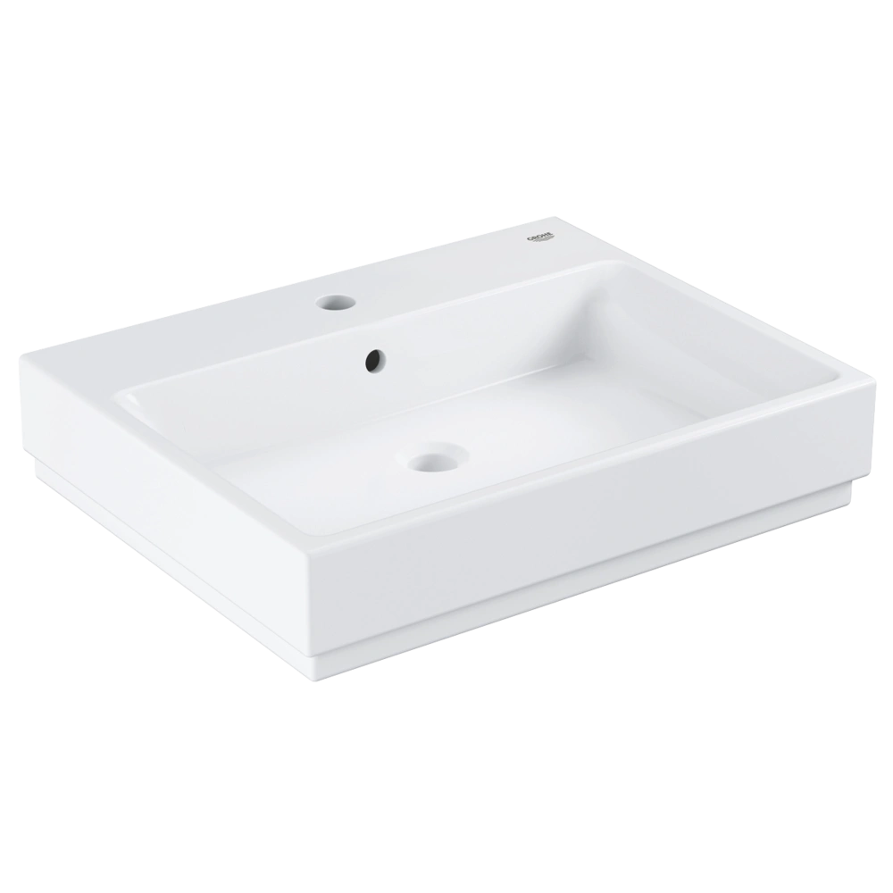 The counter-top basin Cube Ceramic with overflow is suitable for wall mounting. It is equipped with one punched tap hole and 2 more pre-punched tap holes. The washbasin is made of glossy, Alpine White fine fireclay, creating a durable surface built to last. The GROHE PureGuard finish inhibits bacteria and repels dirt and limescale.