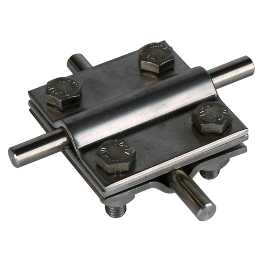 Cross connector with intermediate plate made of stainless steel for above- and below-ground connections of round and flat conductors in cross and T configurations.