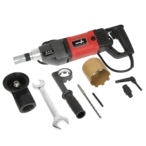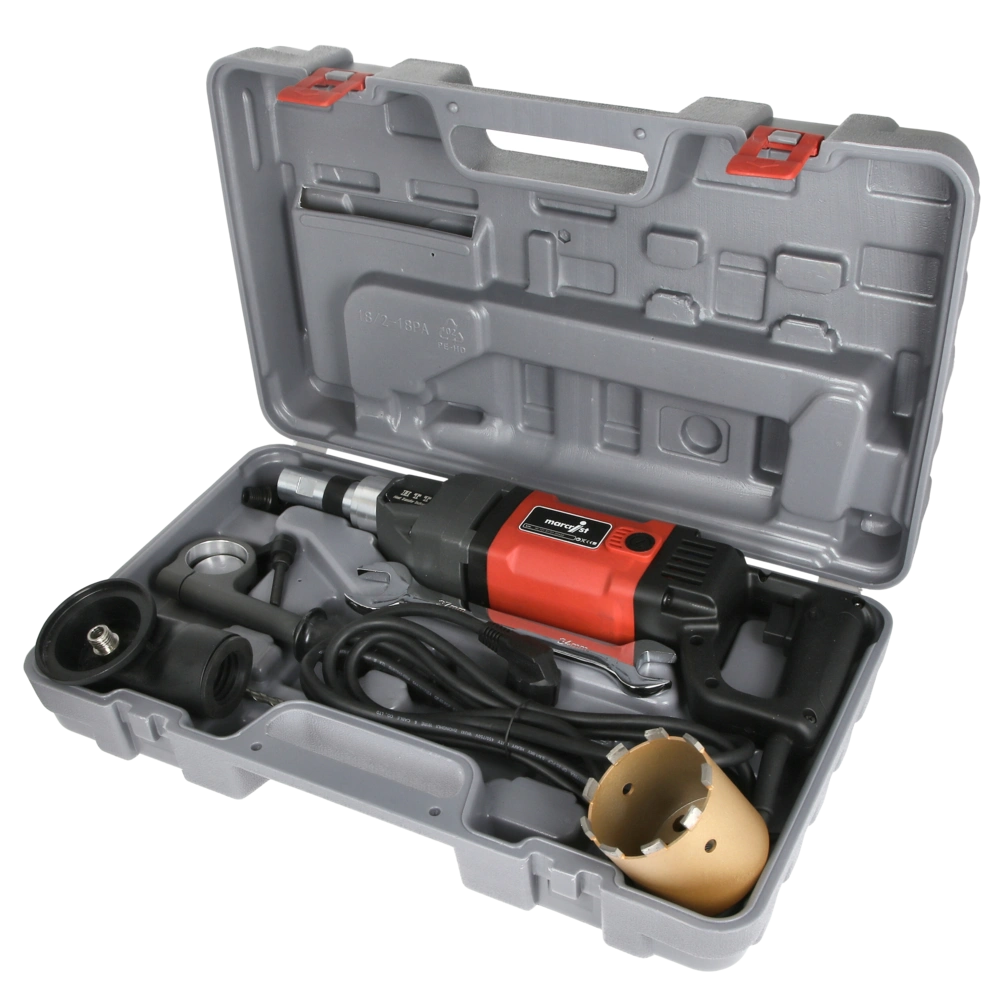 Robust core drilling machine for dry core drill bits. The manually operated machine with soft start has a safety slip clutch and electronic overload protection. The core drill bit is ideal for drillling switch boxes...