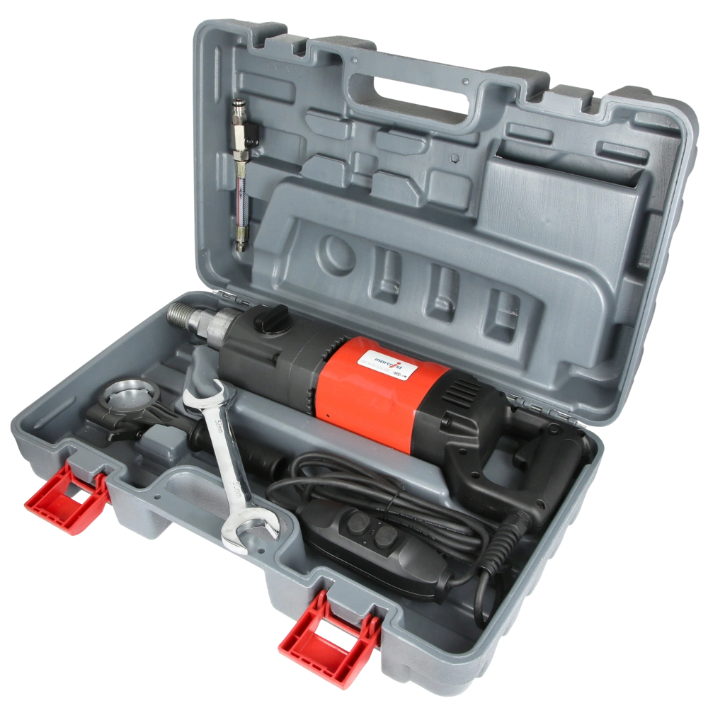 Powerful core drilling machine as hand-held manually operated machine or drill-rig-mounted. The three-gear steps and speed control allow for the precise adjustment to the drill material. Suitable for diameters up to 200 mm. The machine is universally usable for wet and dry core drilling, from reinforced concrete to Poroton. The extensive safety equipment includes soft start, mechanical high-performance slip clutch and a PRCD switch. An electronic overload function protects the electronic components.