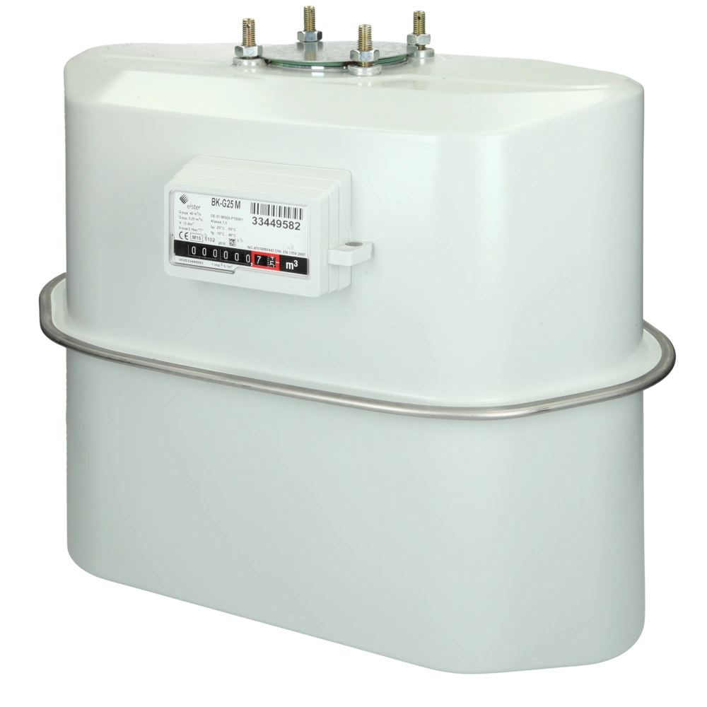 Folded two-pipe gas meter with high measuring accuracy and safety for commercial buildings. The calibrated measuring insert consists of 2 measuring units connected in parallel. They operate on the principle of pneumatic control.