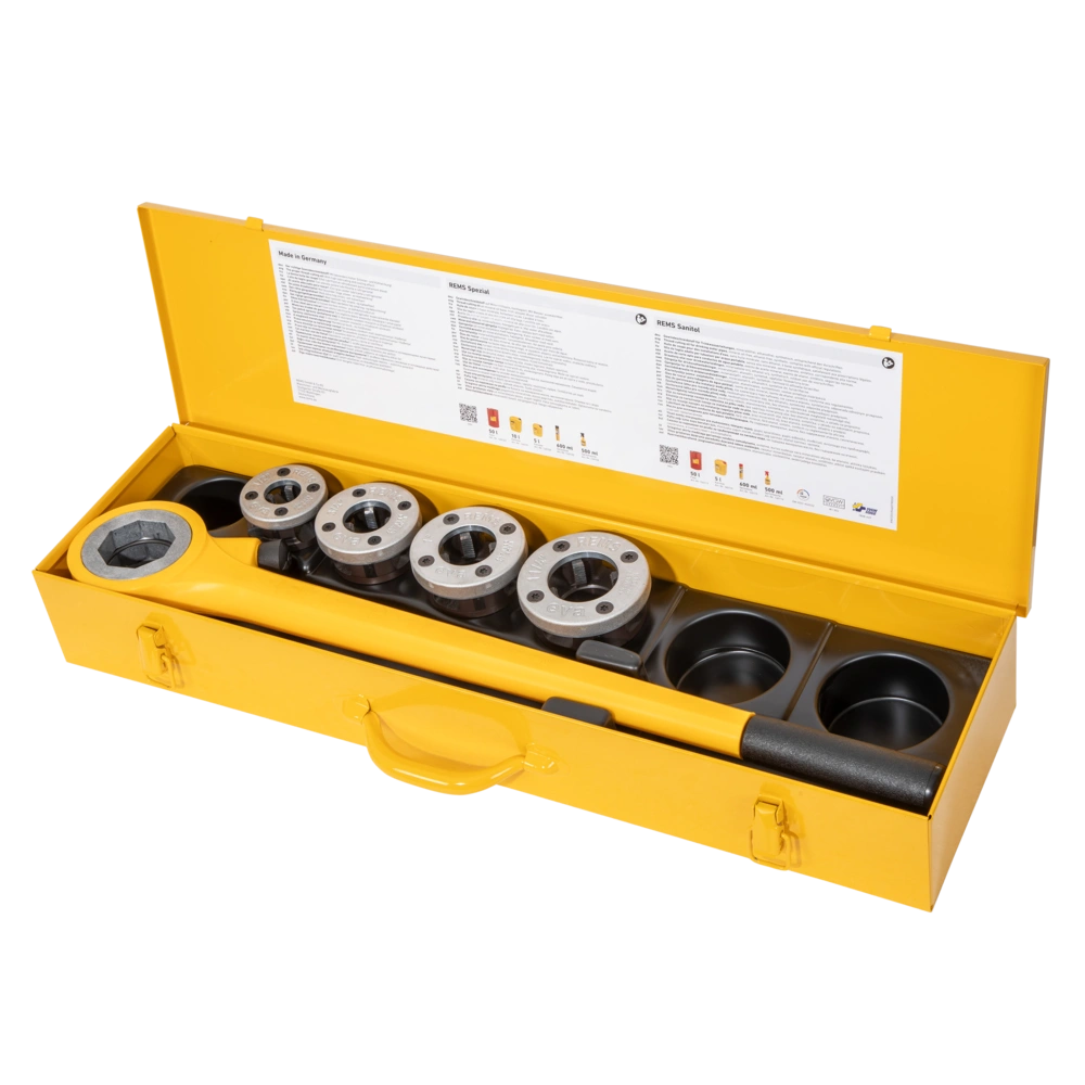 The sturdy, plastic-coated ratchet lever made of steel enables particularly easy starting and thread cutting with a very wide cutting range. The slip-resistant plastic-coated lever can be held well and securely, the ratchet direction can be changed easily. The compact die heads and high-quality dies made of very hardened special steel can be swapped quickly, are versatile in use and have a long life. The set is stored in a sturdy steel sheet case.